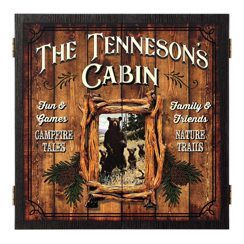 Personalized dartboard and cabinet set! This custom dartboard cabinet will complete the look of any game room with a classic matte black traditional finish with a personalized graphic. Don't leave your wall unprotected from errant throws! The customized dartboard cabinet has a coated finish meant to absorb the toughest of impacts. The sharp, sleek design will complement most decors and will ensure that your dartboard doesn't clash with your style.